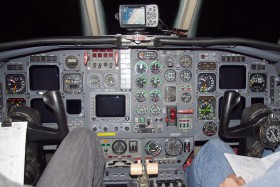 Pohled do kokpitu výzkumného letadla v průběhu letecké expedice zaměřené na pozorování meteorického roje Drakonid.