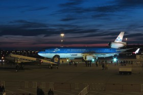 11.11. KLM se dnes loučilo s MD11... okolo 17. hodiny přistál s cestujícími naposledy letoun registrace PH-KCD. Poté projel za zájmu lidí na ploše i za plotem rozlučkové kolečko okolo letiště, a follow me v podobě DC-3 ho zavedlo skrz slavnostní vodobránu na stojánku, kde pokračovalo loučení. Pro fotoúčely byla vedle DC-3 přistavena MD11 reg. PH-KCB.