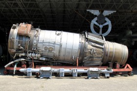 Motor z letounu IL-62. Typ motoru NK-8-4 - první varianta s patnácti ovladatelnými lopatkami vstupního ústrojí.