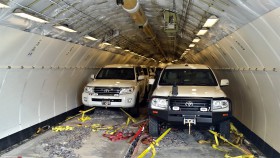 Náklad devíti armádních speciálů na cestě z Prahy do Kábulu. Každý z nich o váze 4,5 tuny.