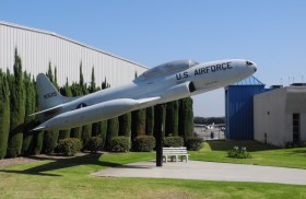 Pylon s letounem na vstupu do Torrance Airport v Los Angeles na Airport Drive, v areálu Zamperini Field. Za stěnou haly vlevo je malý, jen skromný Western Museum of Flight. Areál je také domovem Robinson Helicopter Co., výrobní haly jsou ve východní části areálu.