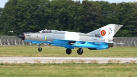 Rumunský MiG-21 na letu z anglického Fairfordu opět pro palivo do Pardubic.