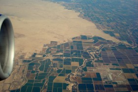 ale kde, lietadlo leti zo zapadu na vychod pozdlz hranice, ktora pretina i tu pust, i tu obrabanu oblast. Hranicu samotnu a zrejme i mesto Mexicali na mexickej strane hranice by bolo vidiet z okien na opacnej strane lietadla.