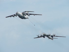 Tankovací verze Iljušinu 76 v ukázce přípravy plnění za letu Tupoleva 95MK.