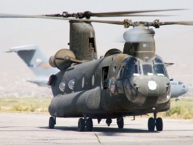 Boeing CH-47 Chinook, v pozadí C-17 USAF