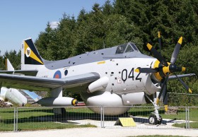 Fairey Gannet - protiponorkové letadlo určené pro službu na palubách letadlových lodí. Zvláštností je použitý pohon! Jsou to dva turbovrtulové motory za sebou, pohánějící každý jednu protiběžnou vrtuli. Při cestovním režimu letadlo letí jen na jeden motor a tím má menší spotřebu = větší dolet. Na snímku je verze AEW s radarem pod trupem = letadlo včasné výstrahy (předchůdce dnešního E-2 a E-3 AWACS) používaný na letadlových lodích britského námořnictva (dříve se ke stejnému účelu používaly Skyraidery se stejně vybouleným břichem, dnes pak Sea King AEW s válcovám kratem radaru na boku.