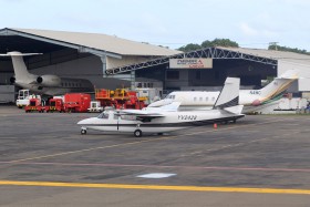 W & P Supply Corp. 29.11 - letadla na ploše letiště v Cartageně (Kolumbie), v pozadí je Gulfstream V reg. N132SD, v popředí stojí Aero Commander asi verze 690 s registrací patřící pod Venezuelu...