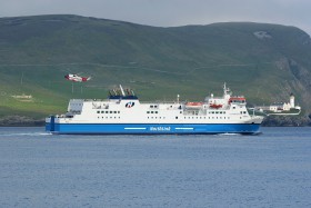 05.07. Hrossey (Northlink Ferries) provázený S-61N Mk.II Bristow Helicopters Ltd proplouvá okolo Bressay Lighthouse na trase Lerwick (Shetlandské ostrovy) - Aberdeen.