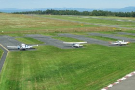 Pohled z řídící věže na West Apron, zleva L-200D Morava (OM-UHC), Cessna F182Q (OM-DCT) a Z-43 (OM-LOW). Provozovatel Žilinská univerzita.