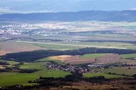 Letiště Poprad-Tatry při pohledu z Tatranské magistrály nedaleko Batizovského plesa. Vlevo v pozadí město Poprad.