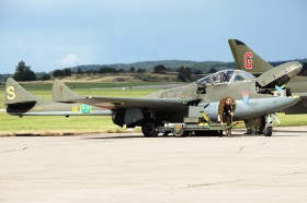 Eskilstuna Flygmuseum AB. Údržba po letecké ukázce, tento Vampire původně létal u švýcarského letectva, v pozadí je Hawker Hunter Mk.58, registrace SE-DXM.