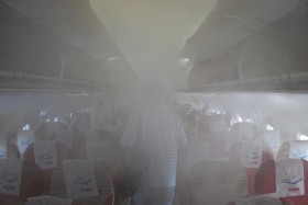 To MS743: Bol to ranny let (odlet cca 8:00), takze vonkajsia teplota este nebola prilis vysoka (odhadujem tak 27 - 28 stupnov), vnutri to tiez bol standard okolo 20 - 21 stupnov. Tento jav sa vo vacsej ci mensej miere vyskytol na viacerych letoch spolocnosti TAM, ktore som absolvoval, avsak v tomto konretnom pripade uz bola viditelnost na palube pomerne nizka. Neviem teda povedat, ci to je zamer s cielom zvysit vlhkost vzduchu este pred odletom alebo len nasledok kombinacie hodnot fyzikalnych velicin (teplota, vlhkost) v exterieri a interieri.