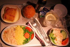 Kuřecí podávané okolo 22 hodiny na 11 hodinovém letu BA54 Johannesburg - Londýn, druhou možností bylo hovězí stroganov. K snídani výběr omeleta vs. "english breakfast".