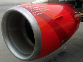 Detail pravého motoru prvního nově zbarveného Airbusu A320 Air Malta, který byl lakovaný v ostravské lakovně. Za povšimnutí stojí text na vnitřní straně motoru, který je na každém z dvojice motoru jiný. Fotografie je pořízena z předního nákladového prostoru letadla.