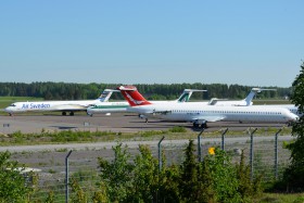 Pidihřbitov MDček na Arlandě. Zcela vlevo Air Sweden MD-81 (SE-DMT) a vedle něj MD-82 (SE-RJP) Air Sweden, to už se ale nestihlo zbavit jména Air Albatros (a barev Alitalie) a aerolinka ukončila činnost (2011). Air Sweden měla i dvě A320, z nichž jednu (SE-RJN) si půjčoval Travel Service (2010 a 2011).