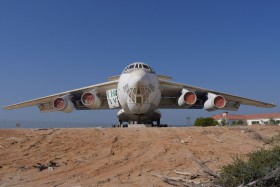 Holubí dům - volně přístupný vrak IL-76 u dálnice ze Sharjah do Ras Al Khaimah slouží holubům arabským jako přístřeší.