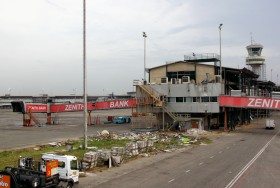 Jeden ze dvou prstů mezinárodního terminálu v Lagosu. U druhého prstu je krom Dreamlineru United ještě 767 Delty, k mostu vpravo je mimo záběr přistavena 747 BA. I tento stav stačí k odbavení více jak 10 milionů cestujících ročně.