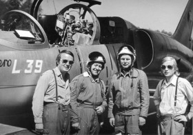 Posádka a technici po úspěšném přistání jednoho z prototypů L-39 Albatros na dnešní D10 na rovném úseku vedle motorestu U čtyř kamenů. Pilot Juraj Šouc zde provedl dva lety jako nácvik před přistáním na dalničním přivaděči u Rosic, odkud byl potom letoun pozemní cestou přepraven na Mezinárodní strojírenský veletrh v Brně v roce 1973, kde Albatros získal zlatou medaili. Druhý zleva je zkušební pilot Juraj Šouc. Prosím o případné doplnění dalších osob na fotografii. Fotografie pochází z mého archivu, bohužel je dnes už autor neznámý.