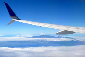 Havajský ostrov Maui se sopkou Haleakala (3055 m n.m.) krátce po vzletu z Kona Airport směr Los Angeles.