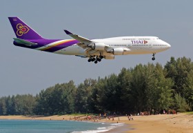 Jeden te dvou B747-400 Thai Airways, které je možno na Phuketu každý den vidět. Obsluhuje ranní a podvečerní rotaci z/do Bangkoku (BKK) Stejný typ ještě nasazuje společnost Rossiya 4x týdně na lince z Moskvy Vnukova.