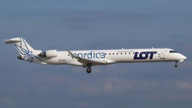 Canadiar RJ-900 demonstruje spolupráci Lotu a estonské Nordicy znaky obou společností. Nordica nahradila zkrachovaný Estonian Air a provozuje své lety pod kódovým označením Lotu.