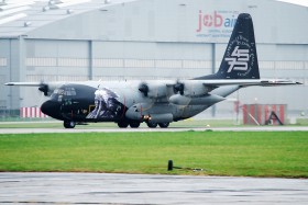 Výroční logojet belgického letectva (70 let od založení 15. křídla a 45 let provozu letounů C-130H Hercules) se stal hostem letošních Dnů NATO. Zachyceno za velmi nepříznivého počasí při pojíždění k pojezdové dráze Golf, kde byl vystaven v rámci statické ukázky.