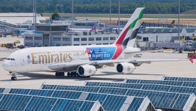 Premiéra nového logojetu Emirates v Mnichově. Letoun, který speciálním polepem na zádi láká k návštěvě letošního World Rugby Cupu ve Francii, se objevil na polední lince EK049 z Dubaje.