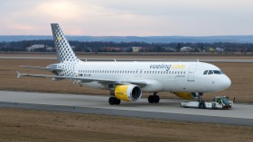 Airbus s názvem "Vueling 10 Years" na lince VY8413 z Lisabonu.