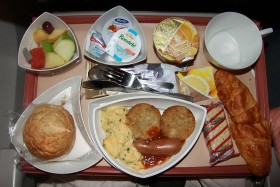 Dubai - Singapore economy class breakfast (scrambled eggs with chives served with a golden fried roesti potato, lamb sausage and a light tomato and chilli relish).