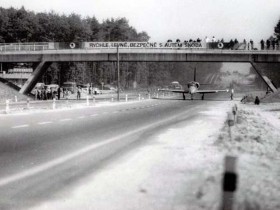 L-39 prototype departure from a R10 highway nearby roadhouse "U ctyr kamenu". Juraj Šouc was in the cockpit according unconfirmed source. There were two flights on R10 for training landing before landing at D1 highway nearby Brno while the aircraft was towed to International Engineering Trade Fair for exhibition later.