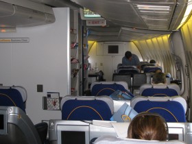 Business Class v přední části Jumba Lufthansy za letu.