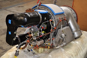 Pomocný energetický zdroj (APU) Garrett GTCP85-129H při vybalování z přepravní bedny. V přední části jsou umístěny agregáty, ještě není naistalován generátor, místo něj je hnědá záslepka, která je vidět v horní části. Modrobílou záslepkou je zakryt vstup vzduchu. Vpravo se nachází olejová nádrž a za ní nesymetricky umístěná spalovací komora. Tento model je jedním ze třech typů APU používaných na Boeingu 737.