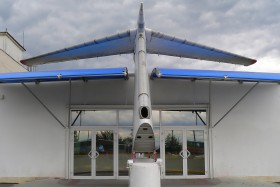 Ocasní plochy Tu-134 spolu s křídly z ULL tvoří přístřešek služebního vstupu na letišti Burgas