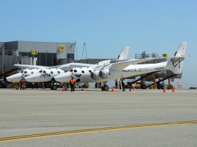 Letoun vezoucí Space Ship 2 přistál u příležitosti otevření terminálu 2 (Scaled Composites LLC).