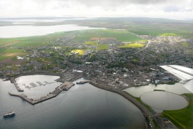 Kirkwall, hlavní město Orknejských ostrovů, před přistáním.