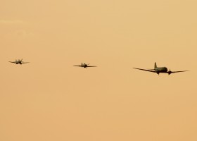 Večerní přílet Battle of Britain Memorial Flight. Průlet nad dráhu 09, následuje rozdělení a jako první dosedá na 09 Spitfire.