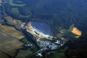 Ta okrová plocha vpravo za hrází je odkaliště? Tam byl původní vápencový lom nebo jen údolí?