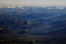 Podhůří Savojských Alp s jezerem Annecy u něhož leží stejnojmenné město i s letištěm (nepartná horizontální linka ve spodní části snímku uprostřed). Za hřeben, který je patrný v pravé části uprostřed snímku, leží město Albertville, známé pořádáním ZOH 1992. Pod zasněženými vrcholky vpravo na horizontu se nachází středisko La Plagne, kde byla i olympijská bobová dráha.