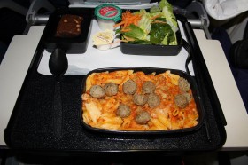 Večera v ekonomickej triede, let San Francisco - London Heathrow
