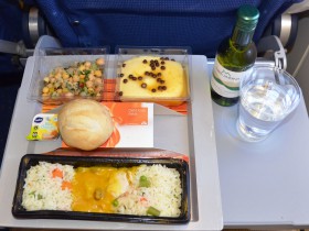 Oběd v ekonomické třídě na lince KL681 Amsterdam - Vancouver.