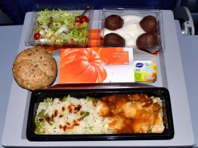 Večeře v ekonomické třídě na palubě letu KL 621 (Amsterdam - Atlanta).