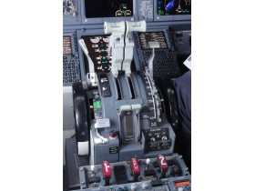 Throttle Quadrant Boeingu 737 během hladinového letu. Design se od prvního letu B737 v roce 1967 prakticky nezměnil.