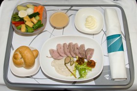 Předkrm, jak bude servírován cestujícím na lince do Soulu: pošírovaná telecí kýta s omáčkou z tuňáka s polosušenými cherry rajčátky a královskou kaparou + Gado Gado salát.