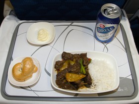 Evropský hlavní chod, jak bude servírován cestujícím na lince do Soulu: hovězí nudličky v omáčce z černého pepře s restovanými paprikami a jarní cibulkou.