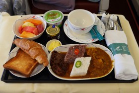 Snídaně ve třídě business na lince ALK102 z Male do Colomba.