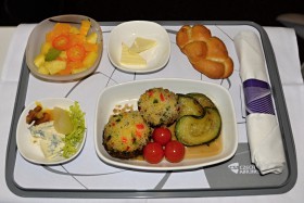 Druhý servis v obchodní třídě na trati Praha-Soul: ovocný salát, zapečené žampiony plněné kuskusem se zeleninou zdobené grilovaným cherry rajčátkem a cuketou, sýrová miska.