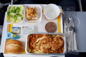 Oběd v ekonomické třídě na trase Frankfurt-New York, let LH400