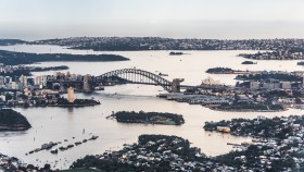 Pohled z okna A380 na dominanty města chvíli před přistáním na letišti v Sydney