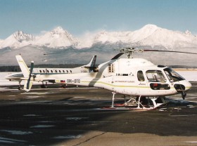 90-te roky. Prvý západný záchranársky vrtuľník na Slovensku pôvodne registrovaný v roku 1990 ako OK-FIT. Dňa 5.5.1997 bol pri núdzovom pristáti do terénu vo Vysokých Tatrách zničený. Scanovaná fotka.