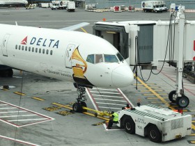 Podvečení "ruch" u Delty v barvách Grammy na JFK.